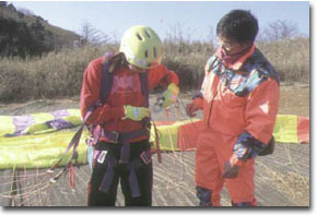 4.グライダーとハーネスを接続 ハーネスにカラピナという道具を使って接続します。 ネジを締め忘れると危険ですのでしっかりと。
