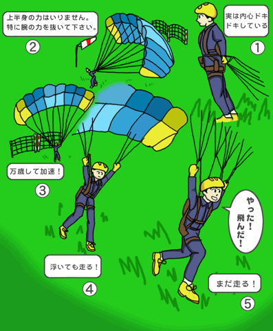 キャノピーが頭上にきれいに広がったら、斜面の傾斜を利用して加速し、パラグライダーに揚力を与えてやります。走りながら、体が持ち上げられる感覚を感じても、飛び乗らずに足が空回りして、自然に体が浮くまで加速します。空中に飛び出したら、まずリラックスして、誘導の言葉どうりに両手を動かしてください。