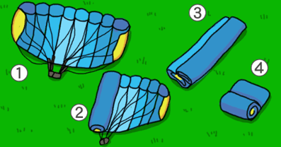 フライトが終了したらパラグライダーを畳んで片付けましょう。まず、パラグライダーをきれいに広げてください。そして、ラインが絡んでいないようにしておいてください(次に使う方のために)。絡んでいなければ、ラインをすべてパラグライダーの上にのせて下さい。のせたら、カラビナを一つにまとめ、カラビナだけパラグライダーの外に出しておいてください。パラグライダーの上にのせてしまうと、ラインが絡んでしまいます。次に、両側からぱたぱたと畳んでいきます。真ん中まで両側から畳んだら、中に入っている空気を抜いてあげましょう。バッグに入る細さにまで畳んだら、空気の取り入れ口(エアーインテイク)の無いほうから丸めて行ってください。そして、バックに入れましょう、装着していたハーネスも同じバックに入れてください。