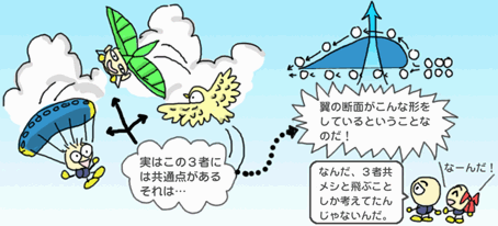 鳥の翼の断面というのは、水滴を横にしたように、前面がふくらみ、後ろが尖った形をしています。これが翼型というもので、この形が飛行には欠かせないものです。翼型は前方から風を受けると、上向きの力、つまり揚力を生じる性質があります。パラグライダーは、地面に広げただけでは単なる紐と布にしか見えませんが、空中に浮かんだ状態でキャノピーを縦に切ると、断面はやはり翼型をしているのです。前から来る風の中に翼を置くと、その風は翼の上下二つに分かれます。このとき、翼の上面はカーブがきつく、下面は緩いので、上を通過する空気の速度が下の気流より速くなり、従って速い気流の上面付近では気圧が低く、下面ではそれが相対的に高くなるので、ここで上と下との気圧差が生じる。これが、気圧の高い下面から低い上面に向かって力を発生させる。この力が揚力です。